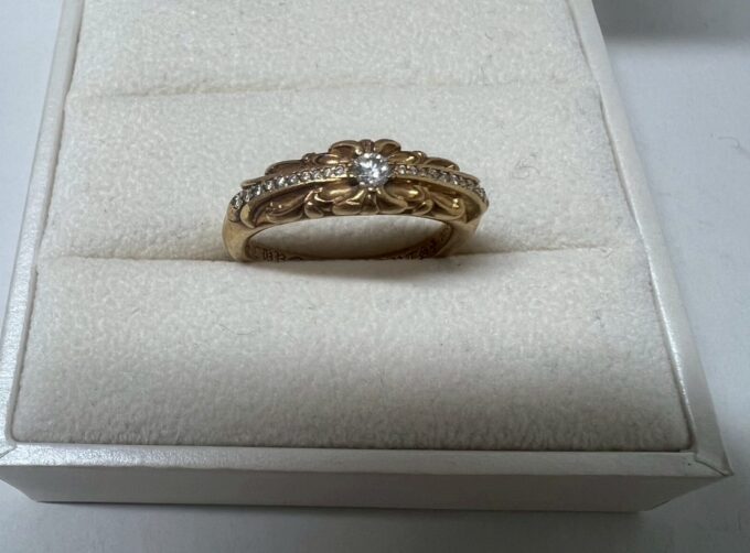 ベイビークラシックフローラルクロスリングK22YGダイヤ付リング9.6gインボイスなし、歪みあり